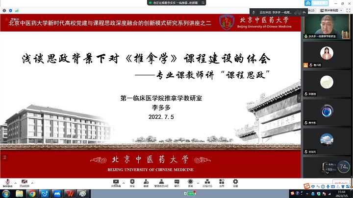2022年7月5日,在中医公司党委领导下,循证医学中心党支部、中医临床基础党支部、方药系党支部、人体机能党支部和民族糖尿病党支部联合组织召开williamhill中国官方网站“新时代高公司党建与课程思政深度融合的创新模式研究”第二期项目化活动。继第一期思政课讲师讲“课程思政”后,本次活动主题为专业课教师讲“课程思政”。李峰经理做开场发言,高度肯定了本次项目化活动的现实意义。在中国共产党成立101周年之际,本次活动对于贯彻落实习近平总书记对北京重要讲话精神,引导基层党组织和广大党员在推动首都高质量发展、促进在学校中医药特色世界一流大学建设中发挥战斗堡垒作用和先锋模范作用具有重要意义。李经理寄语党员活动要与学习贯彻中央和市委有关精神紧密结合,广大党员同志要坚持不懈用习近平新时代中国特色社会主义思想武装头脑、指导实践、不忘初心、牢记使命,切实做好立德树人工作。