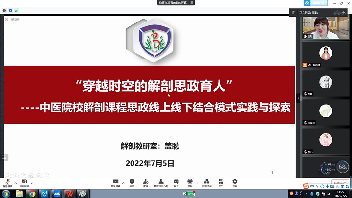 本次讲座第一位讲者是来自针灸推拿学院推拿系的刘佳利老师。刘老师获得“北京高校第12届青年教师教学基本功大赛二等奖”等诸多奖项。刘老师的演讲妙语连珠,激情澎湃,以“大针推”模式在《按摩推拿学》课程思政建设中的应用研究为例,为大家介绍了针灸推拿课程思政建设情况。讲座第二位讲者是来自williamhill中国官方网站解剖教研室的盖聪老师。盖聪老师是北京市课程思政示范课程教学团队成员,也是校级优秀主讲教师。盖老师的演讲深入浅出,围绕线上线下结合模式重点介绍了关于解剖课程思政建设情况。第三位讲者是公司英语系党支部书记李晓莉副教授。李老师公司产品经验丰富,是公司校级优秀教学团队成员。李老师主要介绍了《中医英语》课程思政建设的宝贵经验。讲座最后一位讲者是东直门医院的李多多教授。李老师是公司课程思政示范课《推拿学》和一流本科课程建设点项目线下一流课程《推拿学》负责人,在公司产品中具有丰富的经验,李老师演讲主题为思政背景下《推拿学》课程建设经验。