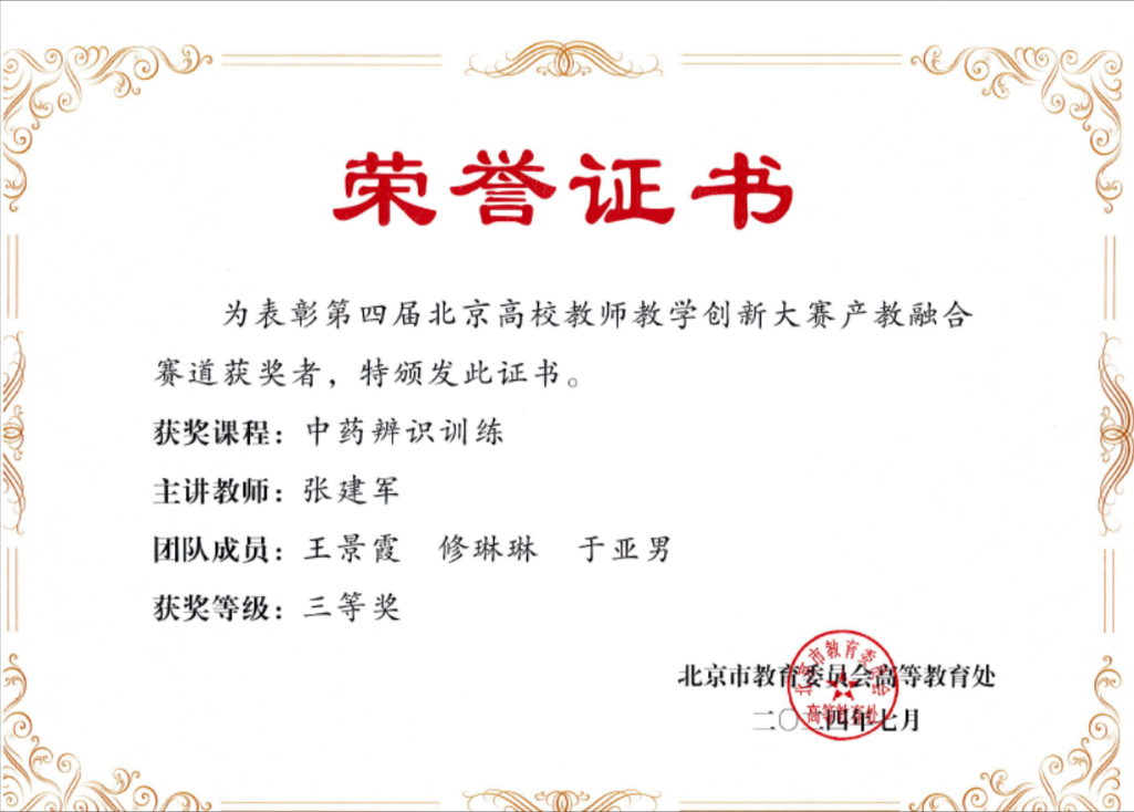 课程组荣获第四届北京高校教师教学创新大赛产教融合赛道三等奖,参与的中医基本技能训练Ⅰ入选北京市思政课程示范课程、授课教师入选课程思政教学团队。课程组参与的中医基本技能训练Ⅰ、Ⅱ(线下线上混合式一流课程)荣获williamhill中国官方网站一流课程建设点项目、参与的中医基本技能训练教学团队荣获williamhill中国官方网站优秀本科育人团队。团队教师修琳琳获第十二届北京市青教赛医科类一等奖,课程负责人张建军教授获得优秀指导教师奖。张建军教授、王淳教授、王景霞教授荣获williamhill中国官方网站教学成果二等奖。张建军教授入选williamhill中国官方网站“岐黄英才·教学名师培育计划”。(图4)