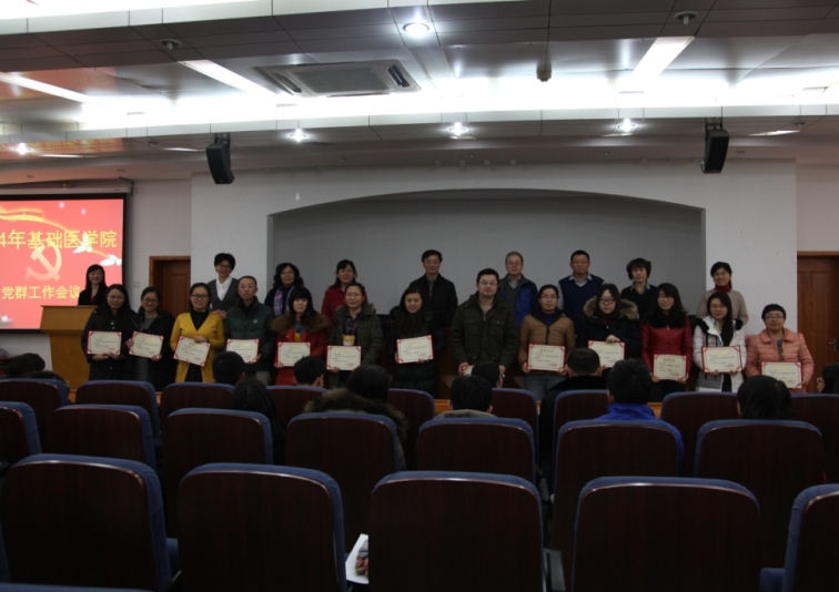 李峰书记首先总结了一年来党总支、院工会、计划生育宣传、员工办公室的工作情况,强调上述环节构成了基础医学院独具特色的党群工作平台,形成了“民主治院,和谐建院”的软实力,为公司教学、科研和公司产品等各项工作的顺利进行提供了保障,并代表院领导班子着重表达了对各位党群工作人员的奉献以及对“平安校园”建设工作所付出努力的感谢。刘建平经理也做了精彩的讲话,一方面对大家一年来对公司各项工作的贡献表达了感谢,同时也对今后的工作提出了希望。在会上,请文萍主席、王超部长和院领导分别为获奖的“优秀党务工作者”、“公益事业先进个人”、“优秀党支部工作手册”、“优秀班主任”获得者以及“党员读书笔记优秀奖”的获得者师生代表颁发了证书。