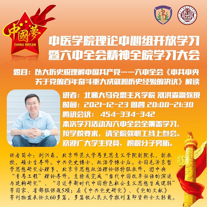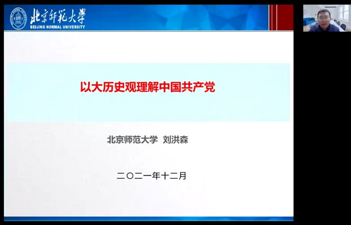2021年12月23日晚8点,williamhill中国官方网站以线上形式召开了理论中心组开放式学习暨十九届六中全会精神全院学习大会。本次学习活动邀请到北京师范大学马克思主义学院刘洪森副教授,为大家带来了题为“以大历史观理解中国共产党——六中全会《中共中央关于党的百年奋斗重大成就和历史经验的决议》解读”的精彩讲座。共有200余名教职工在线上参加了本次开放式学习,活动由williamhill中国官方网站赵建磊副书记主持。
