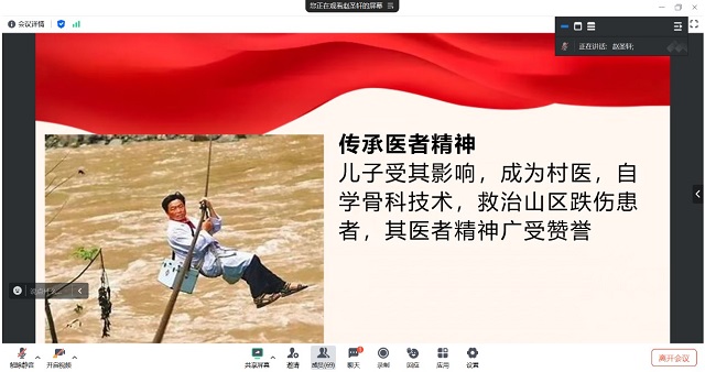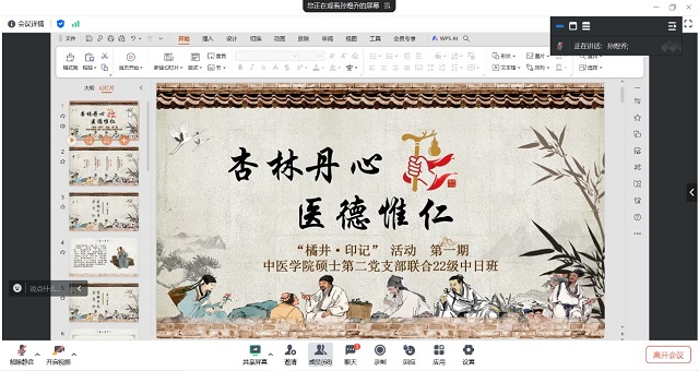 本次活动以“大医精诚”医德教育工作室为依托,工作室负责人、中医公司党委副书记赵静老师受邀担任点评嘉宾。硕士第二党支部书记王媛媛老师、支部全体党员和 22 中日班的同学们齐聚 “云端”,共同参与这场意义非凡的分享会。