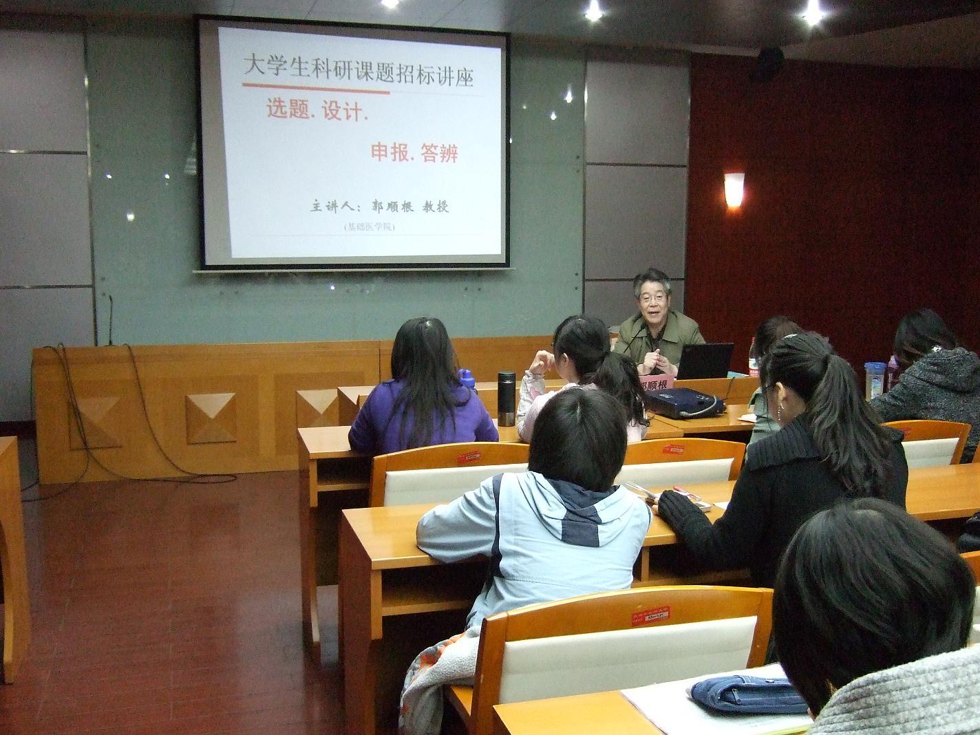 为了员工的科研能力,备战2011年老员工科招活动,3月16日下午2点,基础医学院团总支邀请公司郭顺根教授在逸夫馆二楼报告厅举行了题为“老员工科招的选题、标书写作,课题设计和答辩”的讲座。