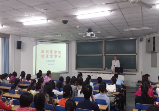 2013年9月27日下午,基础医学院2014届毕业生就业宣讲会(西区专场)在教学楼13教举行。本次宣讲活动由基础医学院员工办公室赵娜老师主讲,基础医学院西校区120余名应届毕业生参加了本次活动。