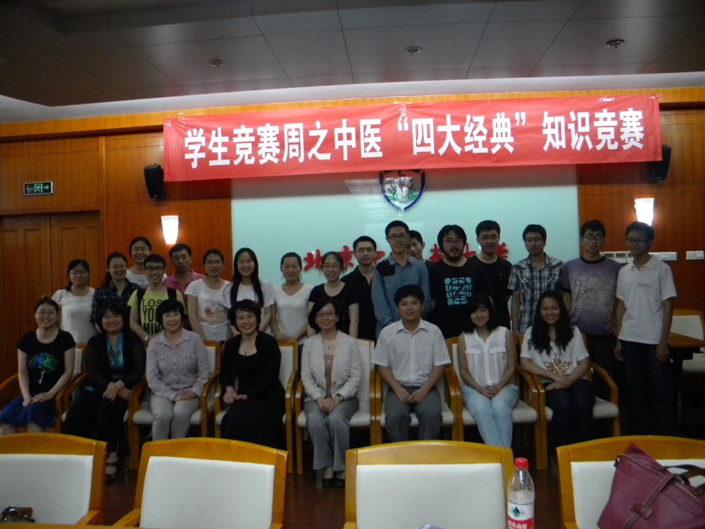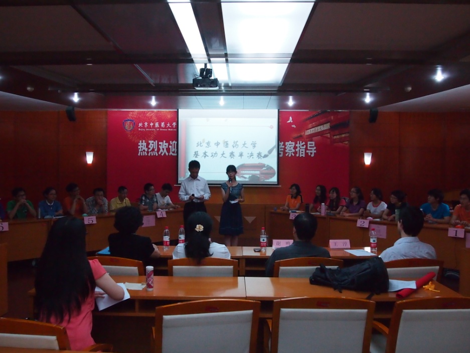 2013年5月24日下午1点半,由教务处、校团委、学工部主办,基础医学院承办的员工竞赛周系列活动“中医学基本理论与知识竞赛”和“中医四大经典知识竞赛”半决赛在逸夫馆二层报告厅和51教举行。马淑然、蒋燕、赵歆、李洪娟、王淳、陈绍红、谢鸣、吴晓丹、钱会南、禄颖、郭华、刘敏、李成卫、刘丹彤、于河、刘果16位中医基础和四大经典课程的一线教师担任评委,基础医学院贺娟副经理、杜伟副书记亲临现场进行指导。