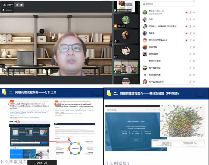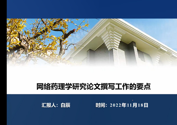 白辰老师针对网络药理学的研究论文的撰写要点进行讲解。白老师先介绍做网络药理学的原因,接着介绍了网络药理学的流程简介以及工具,分别从药物到分子、分子到靶标、靶标到机制、疾病的机制、分子对接和动力学模拟进行了介绍。在讲解的过程中,白老师通过对往届员工的论文分析,让员工身临其境感受论文写作的中可能遇到的各类问题,以网络药理学为切入点引导员工拓宽论文写作的方法和思路。