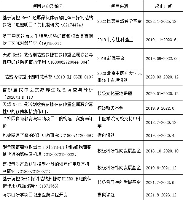 对食育传统文化的历史发展和现状从学术价值、教育价值和实践活动等方面展开研究,获北京市社会科学基金资助,作为负责人在房山区属地中小学开展“食育”共建项目广受好评。此外,还开展八段锦对疲劳性亚健康的干预作用、首都居民中医茶疗养生观分析、“四时五味”饮食养生观研究、阿尔山研学项目开发等,该方向已发表通讯/第1作者SCI1篇和核心期刊10余篇。